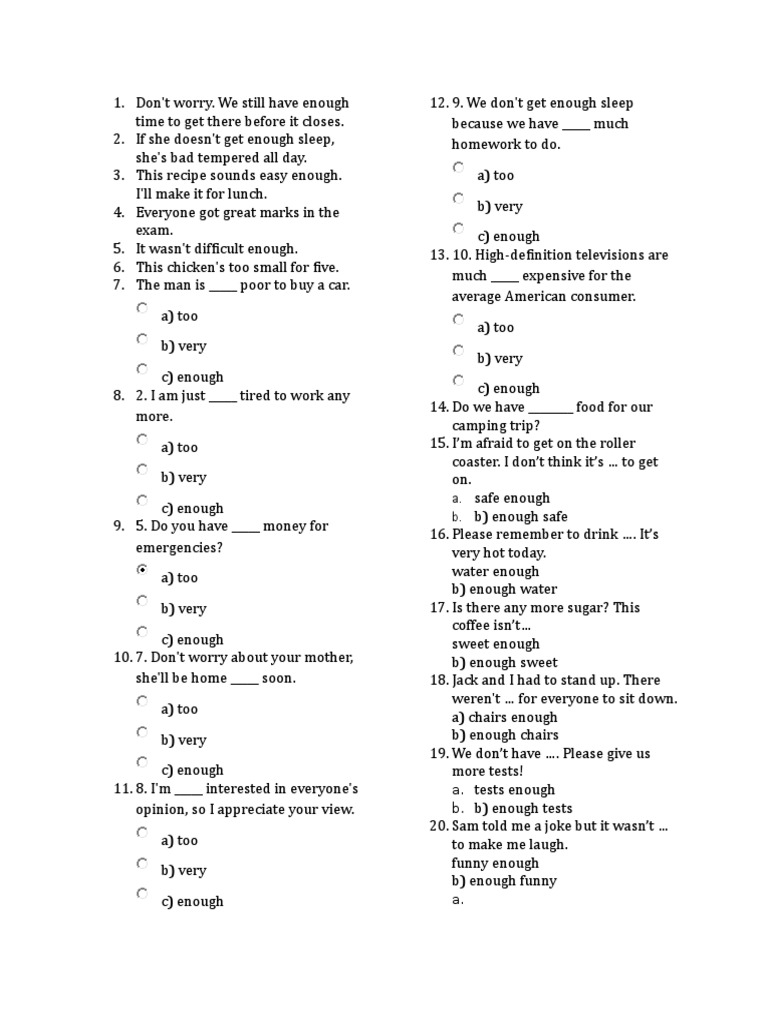 Buatlah 10 soal pilihan ganda tentang too and enough beserta jawabannya. Untuk mengunduh file gunakan tombol download yang tersedia kemudian buka Link download yang muncul. 20 soal very too dan enough bahasa inggris untuk smp kelas 8 materi bahasa inggris kali ini akan berhubungan dengan kata very too dan enough.