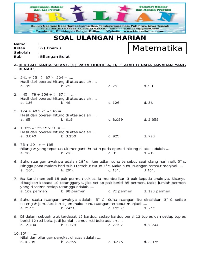 Soal Ulangan Harian Matematika Materi Bilangan Bulat Kelas 6 Diary Guru